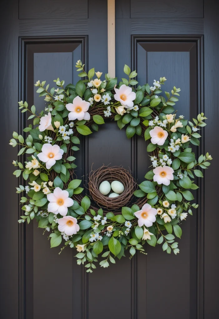 This design leans into the theme of renewal and new beginnings. A small decorative nest with faux eggs or tiny birdsbecomes the focal point, surrounded by light greenery. It tells a subtle story that guests instantly recognize. This is a great conversation starter, especially for families or nature lovers. It’s proof that a wreath can be both decorative and meaningful.