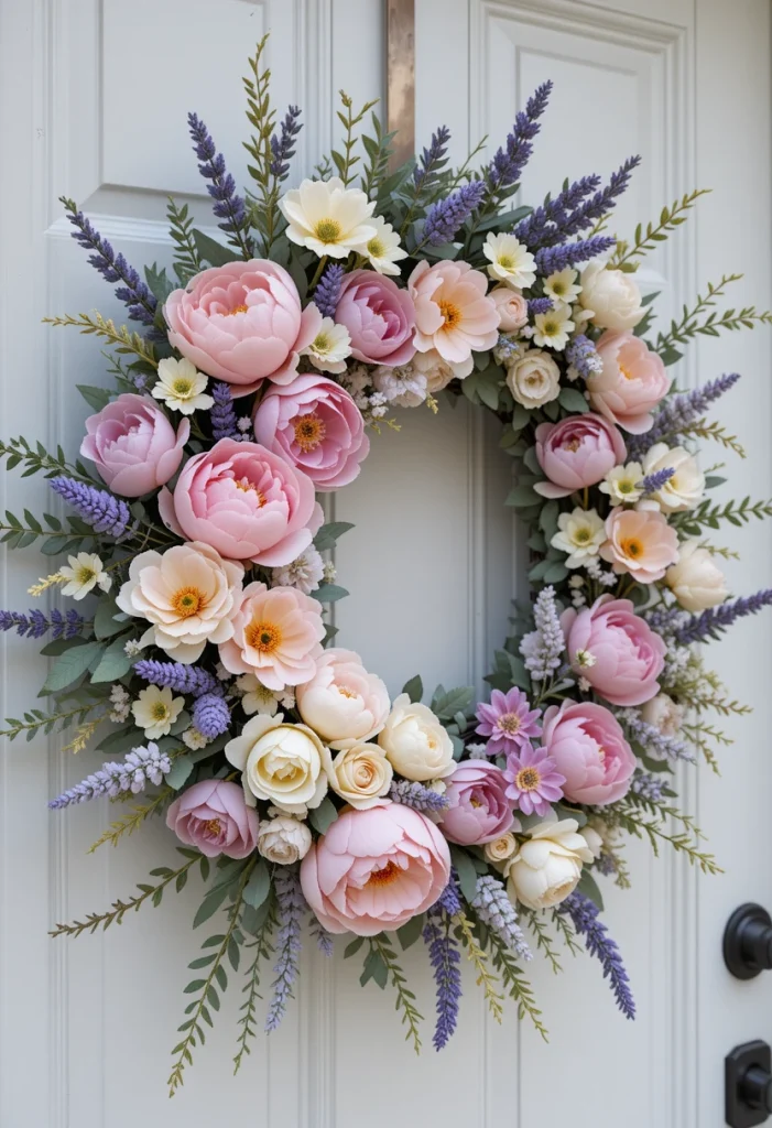 There’s a reason this style never goes out of fashion—it simply works. A mix of soft pink peonies, lavender sprigs, and pale yellow blooms creates a balanced, calming look that instantly says spring. The pastel palette blends beautifully with most door colors, especially white, sage, or light gray. It’s ideal if you want something timeless rather than trendy. I’ve seen homeowners reuse this style year after year because it never clashes with seasonal decor changes.