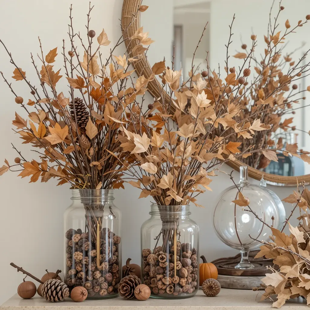 Nothing says fall like bringing the outdoors inside. Incorporate pinecones, acorns, dried leaves, and branches into your decor. Arrange pinecones in glass jars or scatter acorns along your mantel for a casual yet stylish touch. These natural elements add texture and authenticity, making your space feel connected to the season. Plus, they’re budget-friendly and easy to find in your yard or nearby parks.