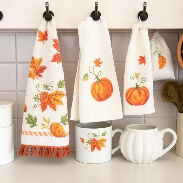 Display autumn-themed dish towels, mugs, or baking ware in your kitchen. Incorporate seasonal motifs like leaves, pumpkins, or acorns. These small touches add charm to your everyday routine and bring the season into your cooking space. Plus, they’re functional decor that can be enjoyed daily.