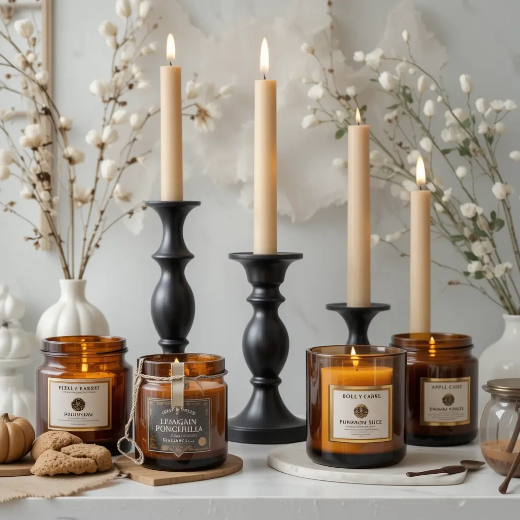 Set the mood with candles in scents like cinnamon, pumpkin spice, apple cider, or vanilla. Choose candles in amber or matte black holders for a sleek look. Light them during mornings or evenings to fill your home with inviting aromas. Candles not only enhance the ambiance but also add a soft, flickering glow that’s perfect for fall evenings.