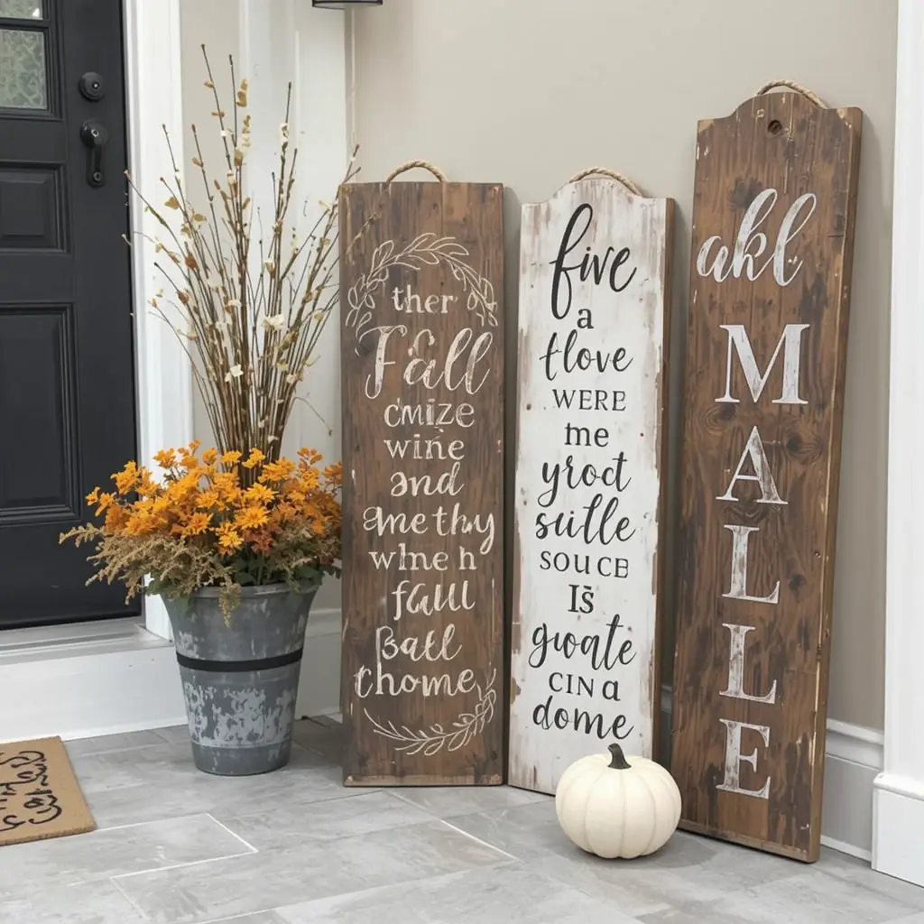 Add wooden signs with fall quotes or greetings near your entryway or inside your home. Look for rustic, distressed finishes to enhance the farmhouse feel. Personalize with your family’s name or a seasonal message for extra charm. These signs serve as a delightful focal point and conversation starter.