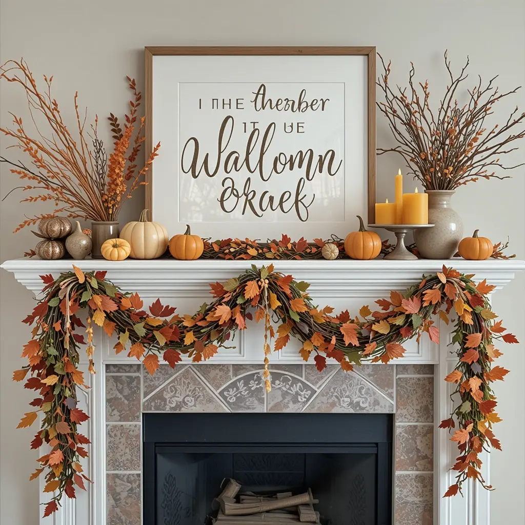 Your mantel is a prime spot for fall decorating. Layer garlands of faux autumn leaves or greenery, add candles in warm hues, and place small pumpkins or gourds. Incorporate framed art with autumn-inspired motifs or quotes for a personal touch. Remember, less is more—avoid clutter by balancing height and color. It’s all about creating a cozy focal point that welcomes guests.