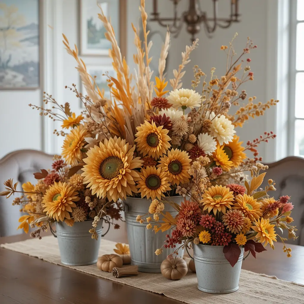 Fresh or faux florals in fall hues brighten up any corner. Think dried sunflowers, mums, or chrysanthemums. Arrange them in vintage vases or rustic buckets for a charming look. Place floral arrangements on your dining table or entryway for an instant seasonal upgrade. These blooms bring life and color, making your space feel vibrant and welcoming.