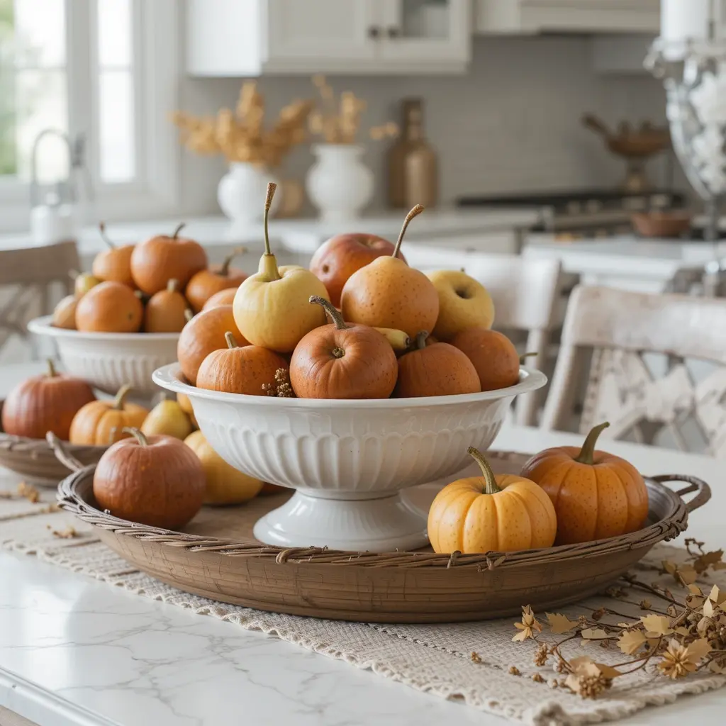 Fill bowls with apples, pears, or even small gourds on your kitchen counter or dining table. Not only do they look beautiful, but they also smell fresh and inviting. Use vintage baskets or rustic trays to enhance the farm-to-table aesthetic. It’s an effortless way to add color, texture, and a touch of harvest charm to your home.