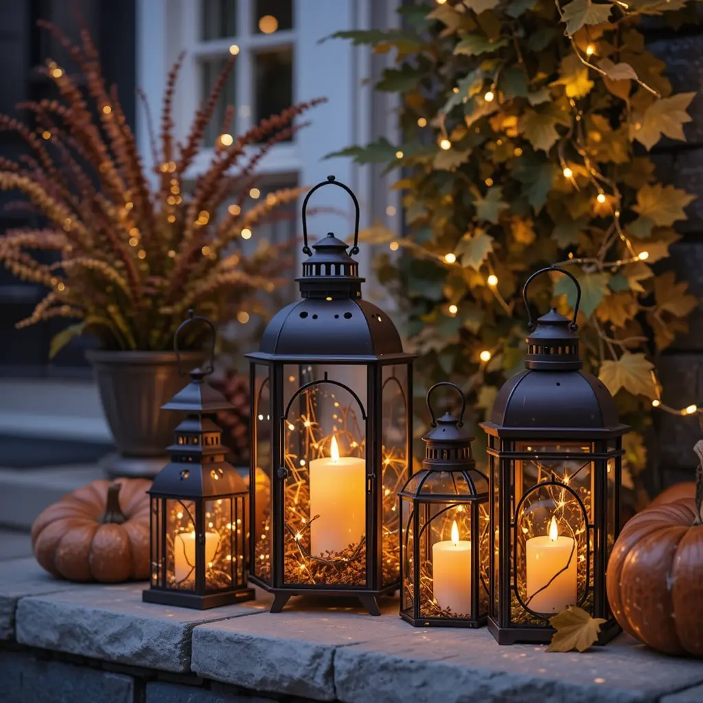Create a cozy glow with metal lanterns filled with candles or fairy lights. Place them on porches, tables, or mantels for a warm ambiance. String lights woven through foliage or draped along walls add a magical touch, perfect for fall evenings. These lighting elements enhance the cozy, inviting atmosphere that fall decor aims for.