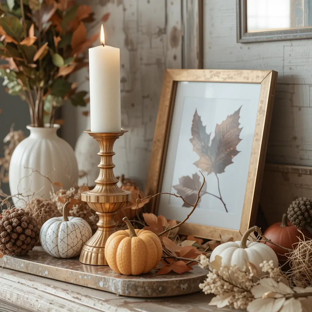 Add a touch of glam with gold or copper decor pieces, like candle holders or picture frames. Metallics pair beautifully with natural textures and warm hues, elevating your decor. Use them sparingly to add sophistication without overpowering the cozy aesthetic. They bring a subtle shimmer perfect for fall’s warm palette.
