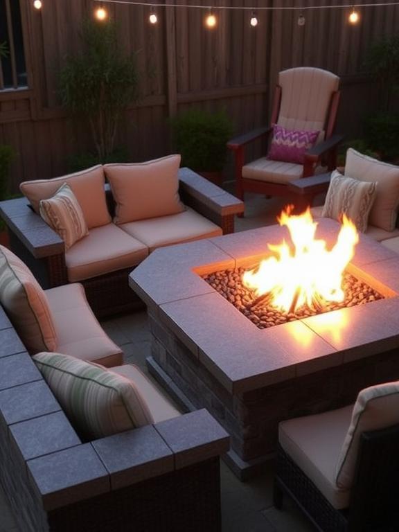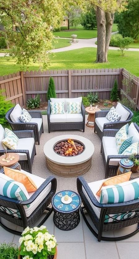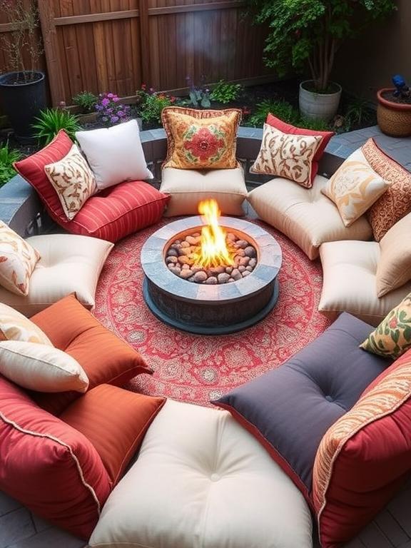 For a unique, bohemian vibe, consider large floor cushions arranged around your fire pit. Weather-resistant outdoor cushions in rich fabrics create an intimate, lounge-like atmosphere that encourages relaxed conversations. I tried this setup for a small gathering, and everyone loved how casual and comfortable it felt.