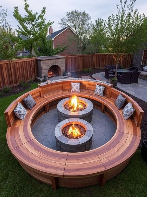 Curved seating that mirrors your fire pit’s shape creates incredible visual flow and ensures optimal heat distribution for all guests. I worked with a local craftsman to build a curved bench that follows the arc of my round fire pit, and the result is stunning.