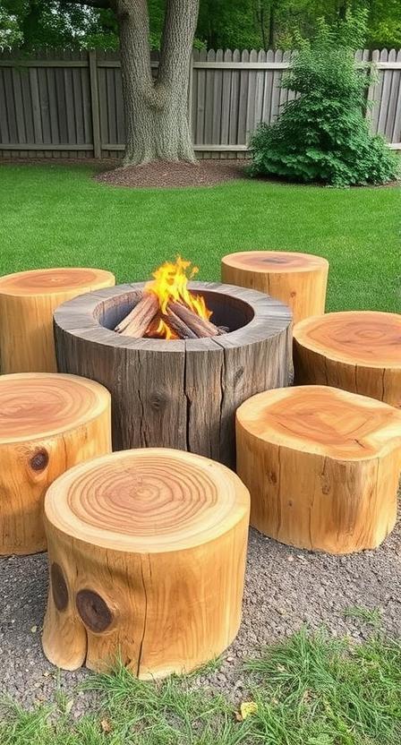 Sand them smooth and apply a protective finish to prevent splinters and weather damage. Different sized stumps create visual interest and accommodate guests of various heights. You can even hollow out larger stumps to create unique planters that double as seats.