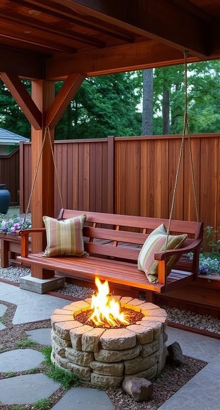 Hanging swing benches bring a playful element to your fire pit area while providing comfortable seating for two. The gentle motion is incredibly relaxing, especially when combined with the hypnotic flames. I installed one facing my fire pit, and it’s become the preferred spot for morning coffee and evening wind-downs.