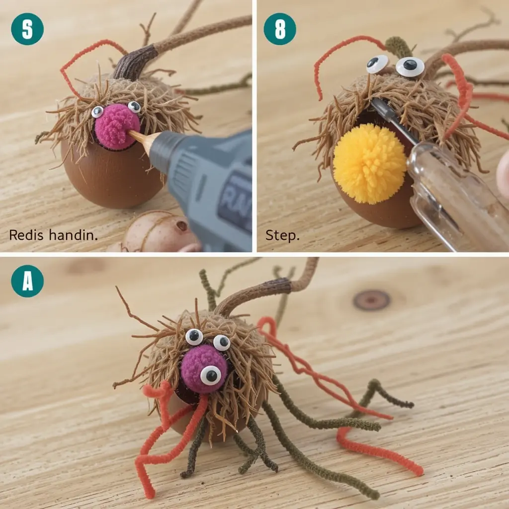 What you need: Acorn caps, pom poms, googly eyes, glue