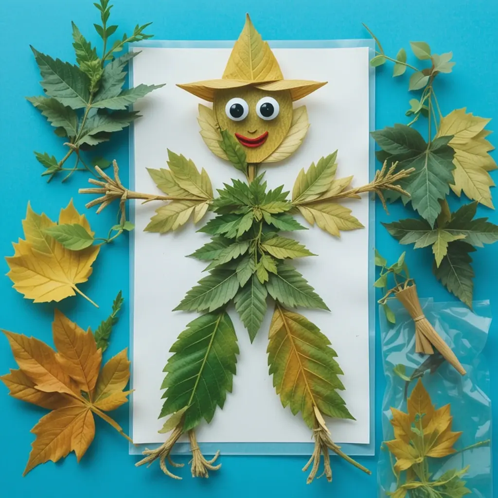 Glue various leaves onto paper to create the shape of a body, arms, and legs.