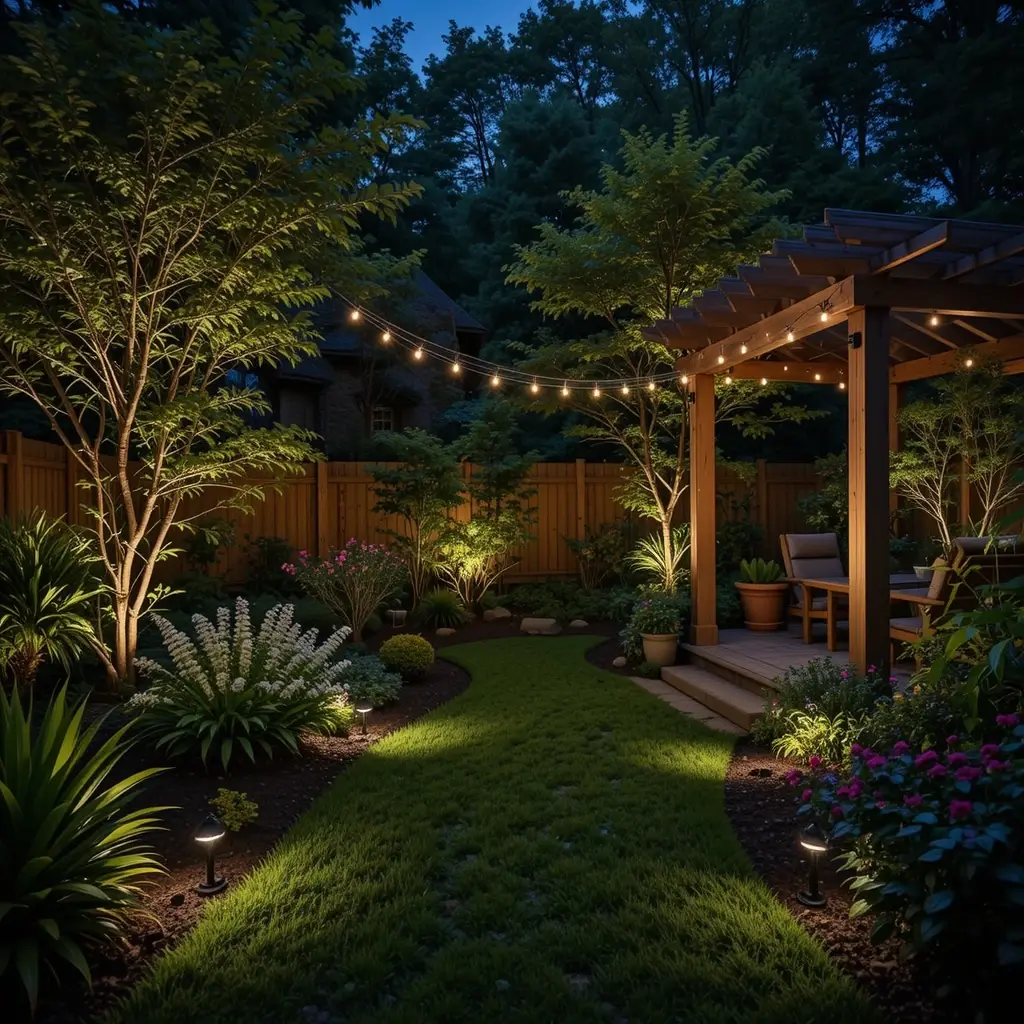 Uplighting showcases specimen plants dramatically. Downlighting from trees creates beautiful shadows. The key is layering different types of light rather than flooding everything with harsh brightness.