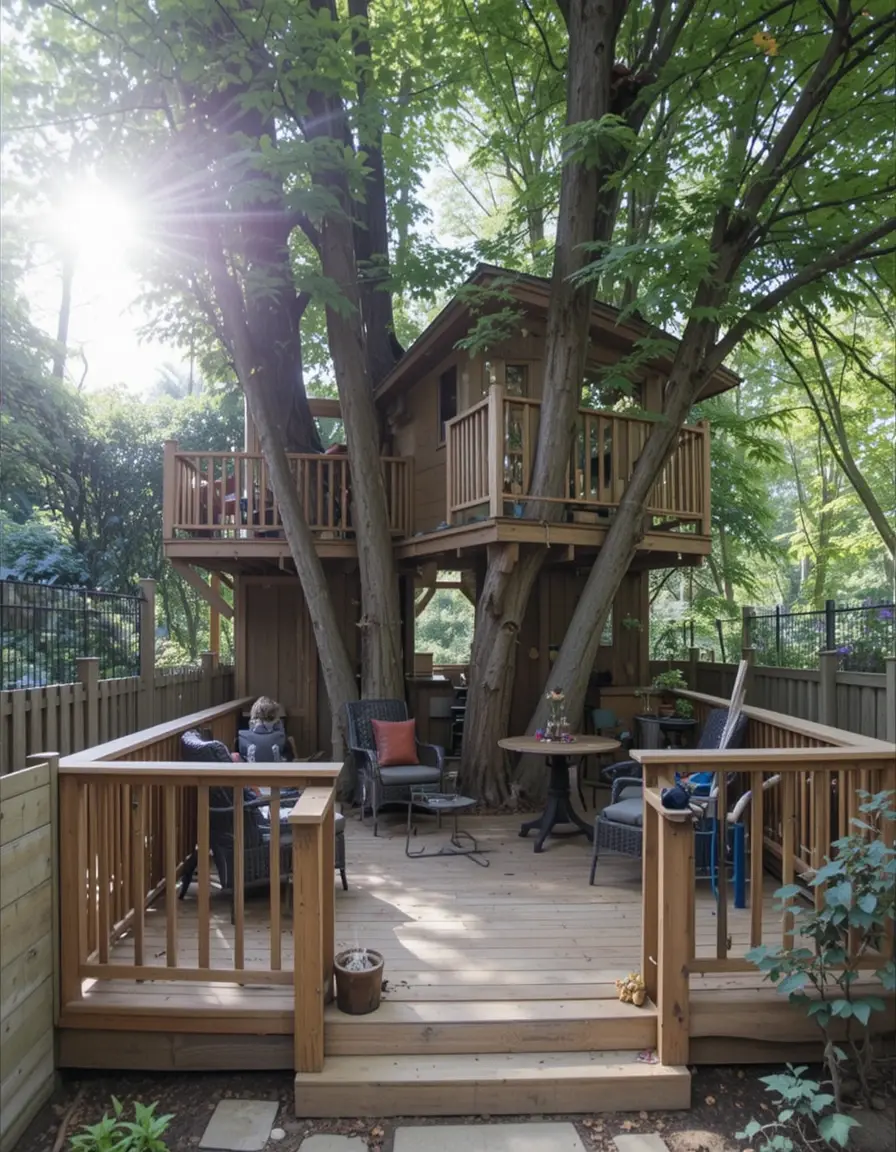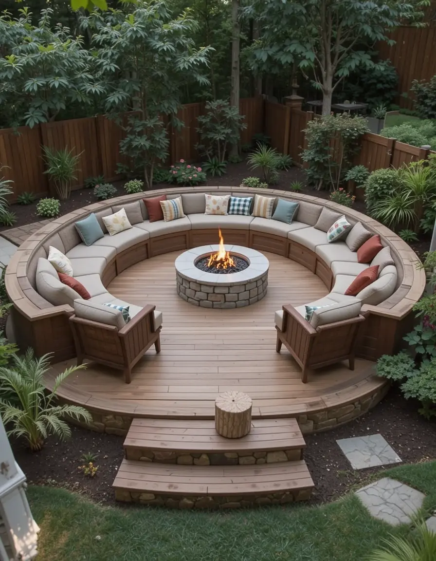 Create a deck area that’s slightly lower than ground level with built-in seating around the perimeter. Add a central fire pit or low table. This intimate design encourages conversation and feels cozy and protected.