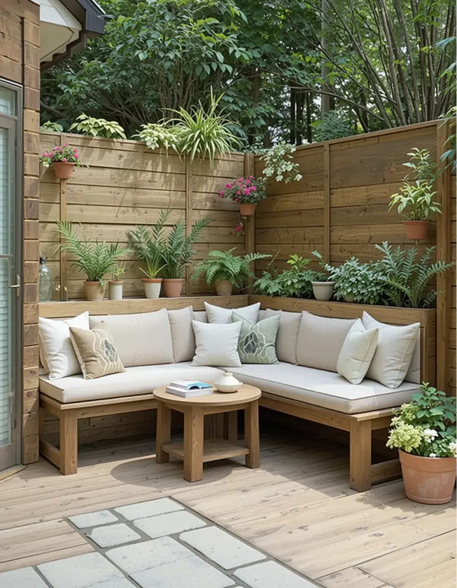 Create a quiet corner deck perfect for reading and relaxation. Add built-in bench seating with comfortable cushions and a small side table for books and drinks. Position it to catch morning sun or evening shade.