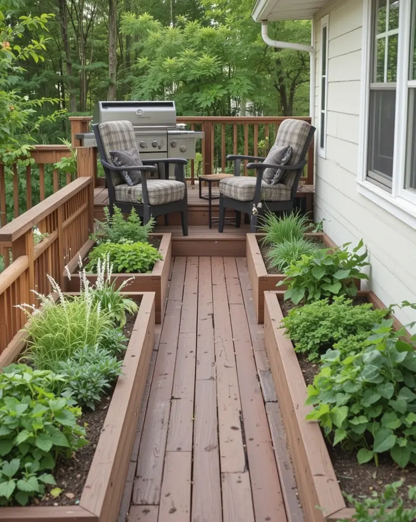 Incorporate raised planter boxes directly into your deck design. Use them as natural dividers between seating areas or as borders along the deck’s edge. You’ll have fresh herbs and flowers within arm’s reach while you relax.