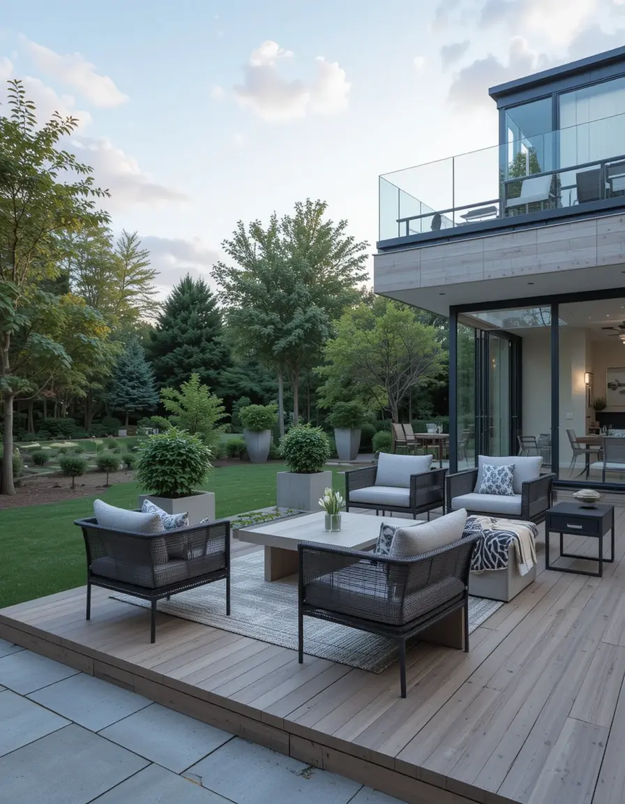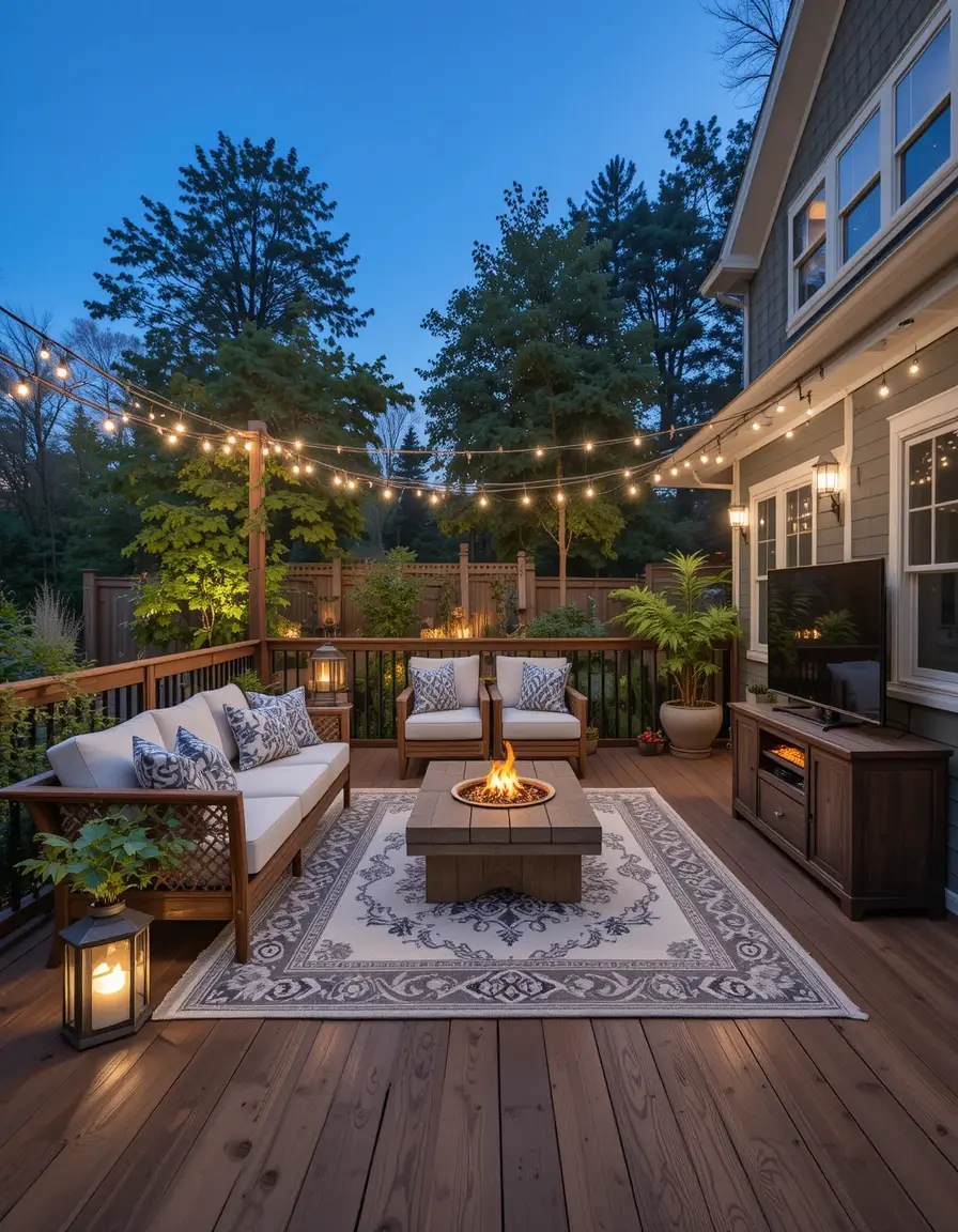 Design your deck like an indoor living room with distinct furniture groupings. Include a sofa area, dining space, and entertainment zone. Use outdoor rugs and lighting to define each area and create a cohesive look.