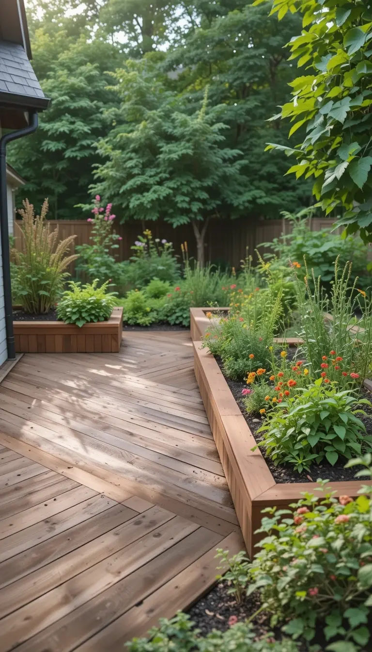 Create a deck that appears to hover above your garden beds. Leave gaps between deck boards for plants to grow through. This design blends your deck seamlessly with the surrounding landscape and lets you walk among your flowers and herbs.