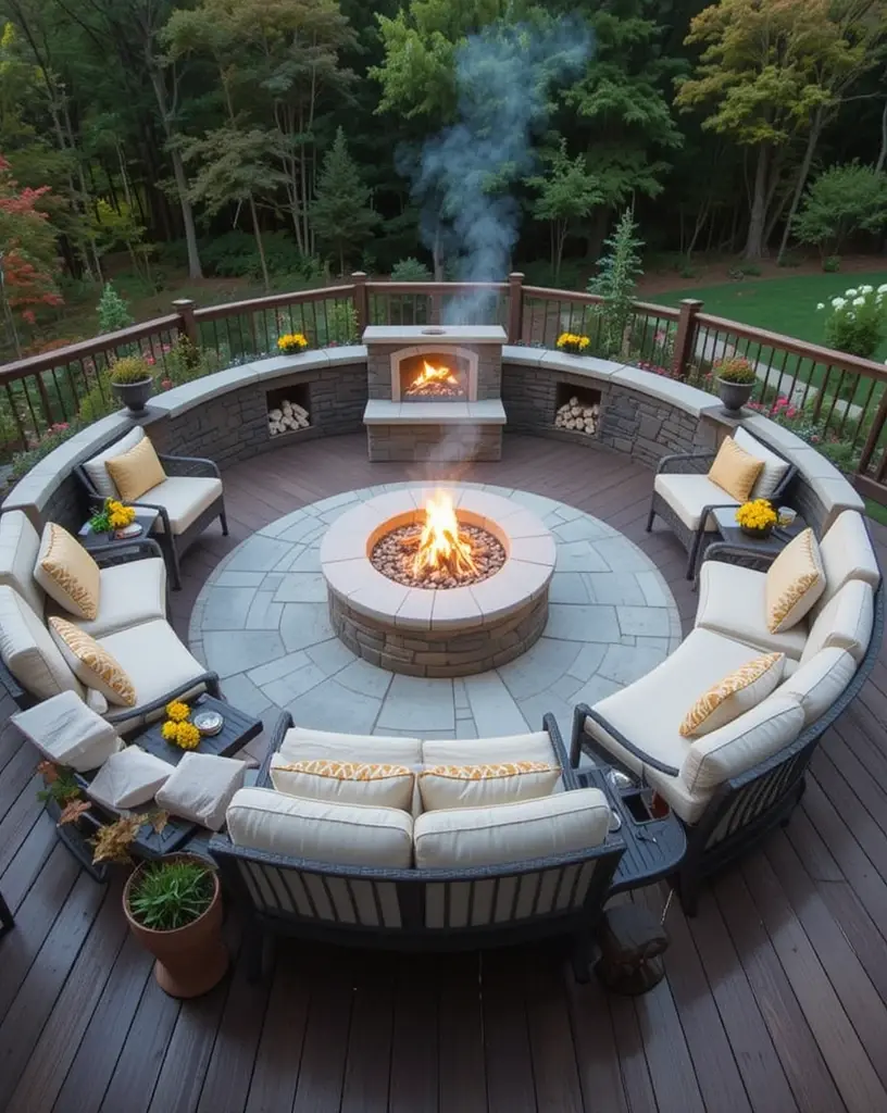 Design your entire deck around a central fire pit area. Arrange built-in seating in a circle around the fire pit to encourage conversation. This creates a cozy gathering spot that extends your outdoor season well into fall.