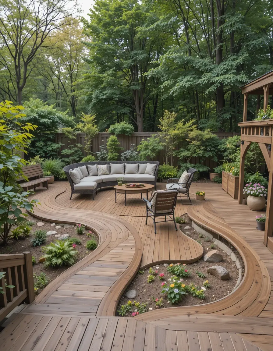 Skip the traditional rectangular deck and create flowing, curved lines that follow your garden’s natural contours. This organic design feels more integrated with nature and creates interesting seating nooks.