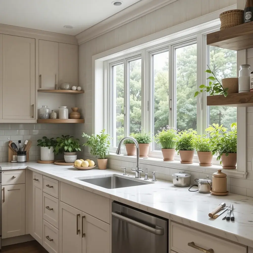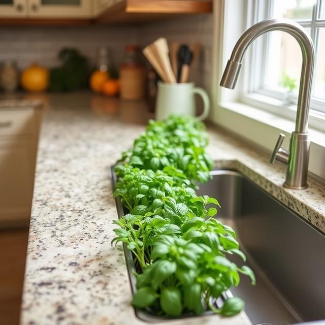 Turn part of your counter into a mini herb garden strip, ideally near the window or under a grow light. It brings freshness and greenery into the kitchen. Plus, it’s practical—fresh basil, anytime.