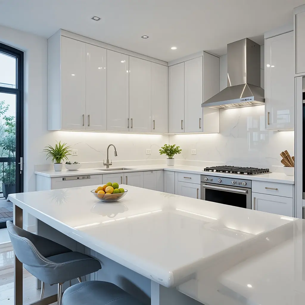 A high-gloss finish can make your kitchen feel brighter and more expansive, especially in smaller spaces. It reflects light, making everything feel open. Best on sleek materials like lacquered quartz or solid surface.