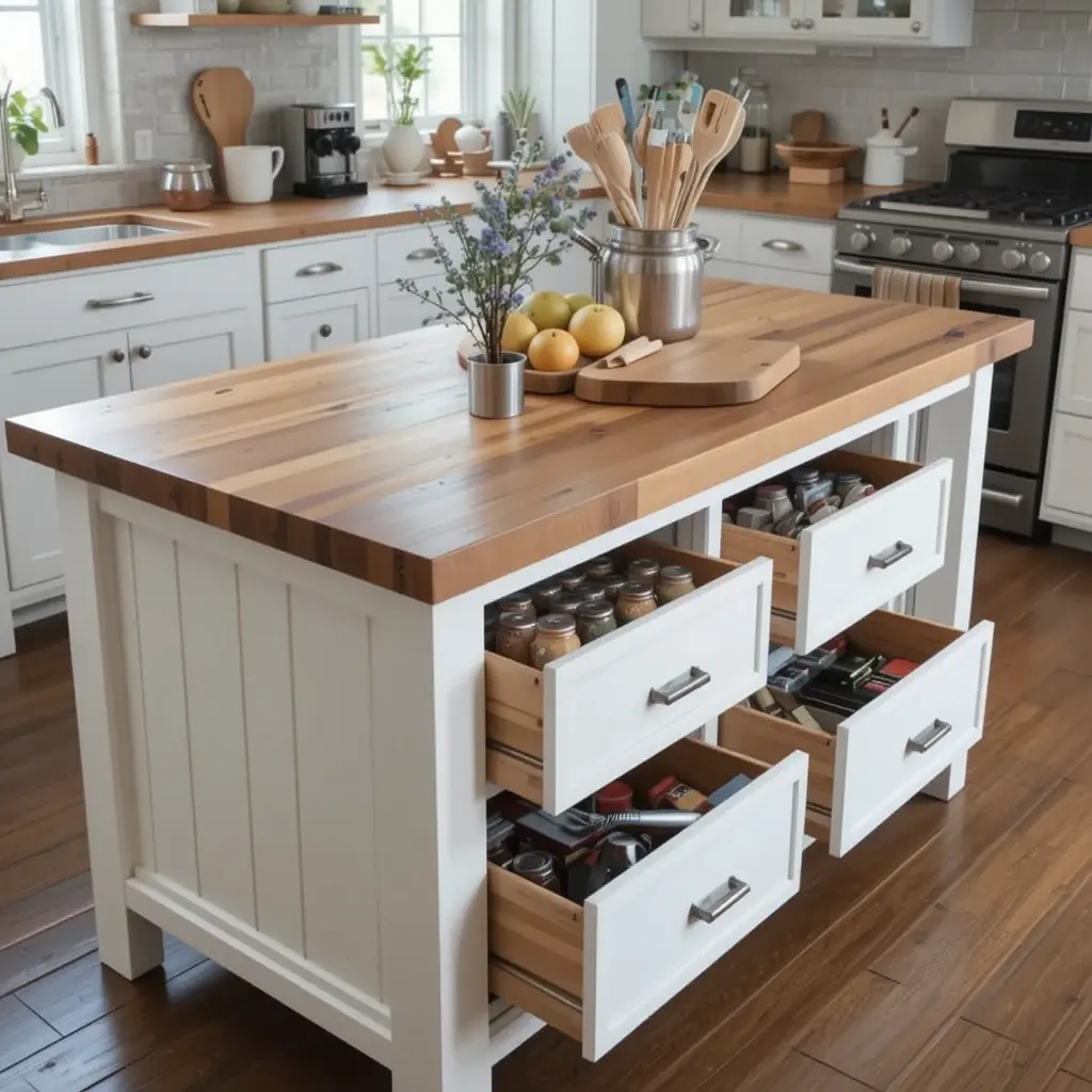 Butcher block counters are warm and inviting, but here’s the twist—integrate hidden storage beneath. This is especially handy for small kitchens where every inch counts. You get that rustic vibe and extra function.