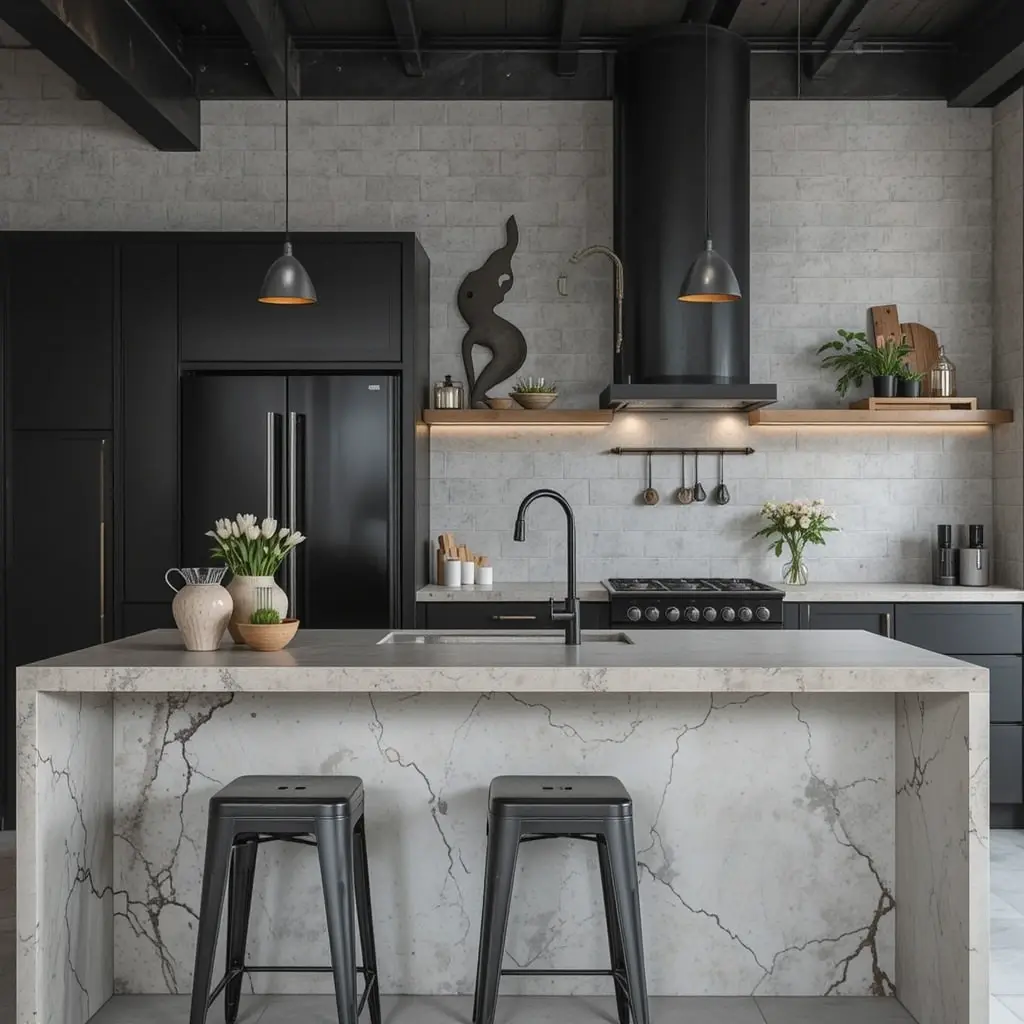 Concrete counters bring that urban loft feel into your kitchen. Pair them with black fixtures and matte finishes for a cool, industrial look. They’re surprisingly durable and age beautifully over time.