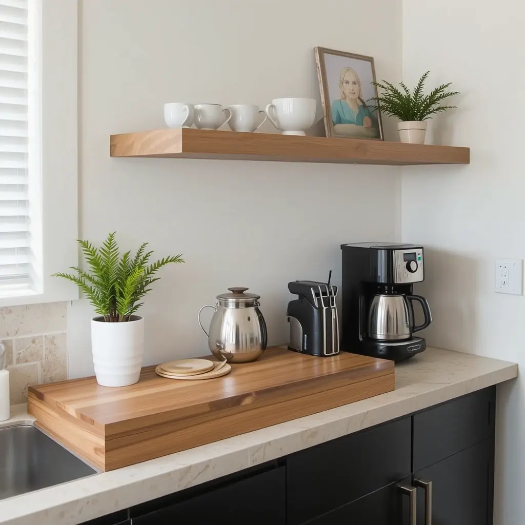 Extend your countertop into a floating shelf that hugs the wall. It’s perfect for coffee stations or displaying ceramics, without taking up counter space. A small tweak with a big payoff in style and storage.