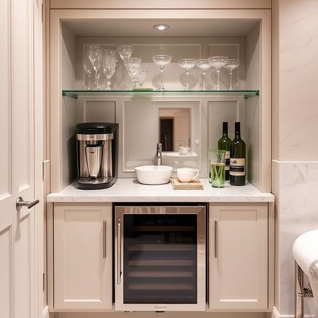 Bring morning convenience directly to your bathroom with a dedicated beverage station featuring a small coffee maker, mini-refrigerator, or wine cooler for evening relaxation. Include storage for mugs, glasses, and your favorite beverages, along with easy-to-clean surfaces for preparation. This unexpected luxury eliminates trips to the kitchenduring your morning routine or evening bath, making your bathroom feel more like a comprehensive wellness suite than a basic necessity.