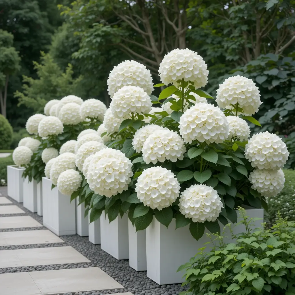 ‘Incrediball’ hydrangeas work perfectly for this aesthetic. Their pure white blooms and rounded shape complement contemporary design without overwhelming the space. It’s sophisticated without being stuffy.