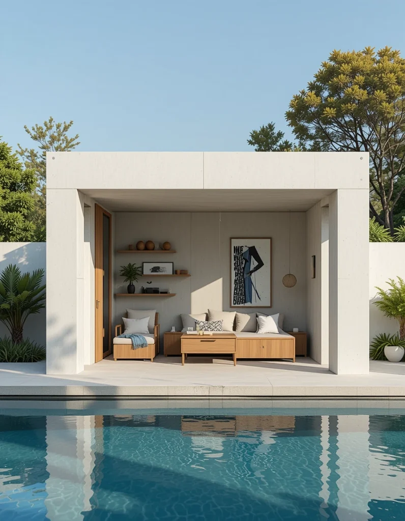 A minimalist cabana relies on clean lines, neutral palettes, and uncluttered surfaces. It’s ideal for pool designs that already have strong architectural features. Using materials like concrete, steel, and wood keeps the look balanced rather than cold. Hidden storage can keep towels, floats, and accessories out of sight. People choose this style when they want a space that feels calm and organized.