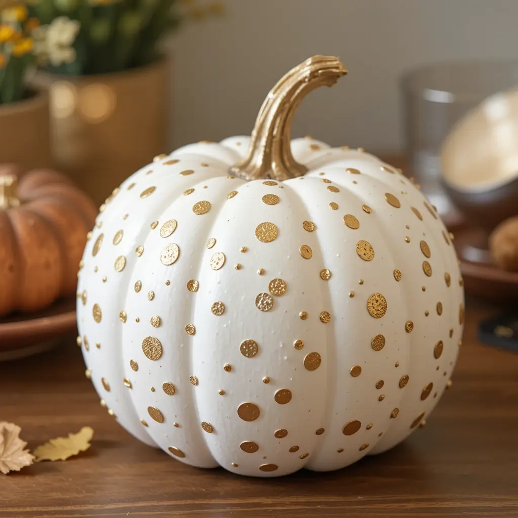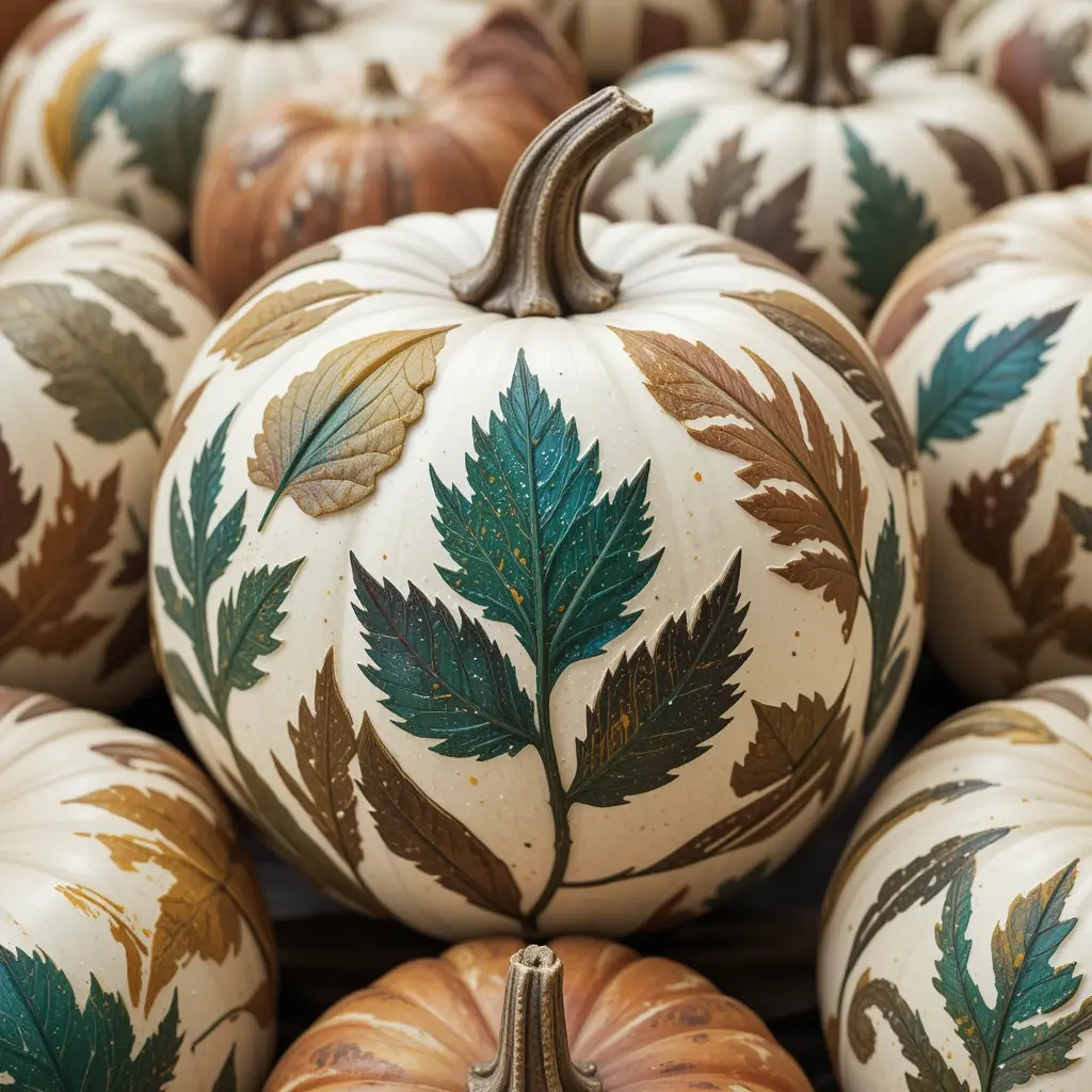 Use real leaves as stencils or stamps. Brush them with paint, press them onto the pumpkin, and peel them away to reveal a beautiful, textured leaf print. It’s earthy and creative, and you can use all kinds of color combos depending on your vibe. This looks especially good in groupings of pumpkins with different leaf patterns.