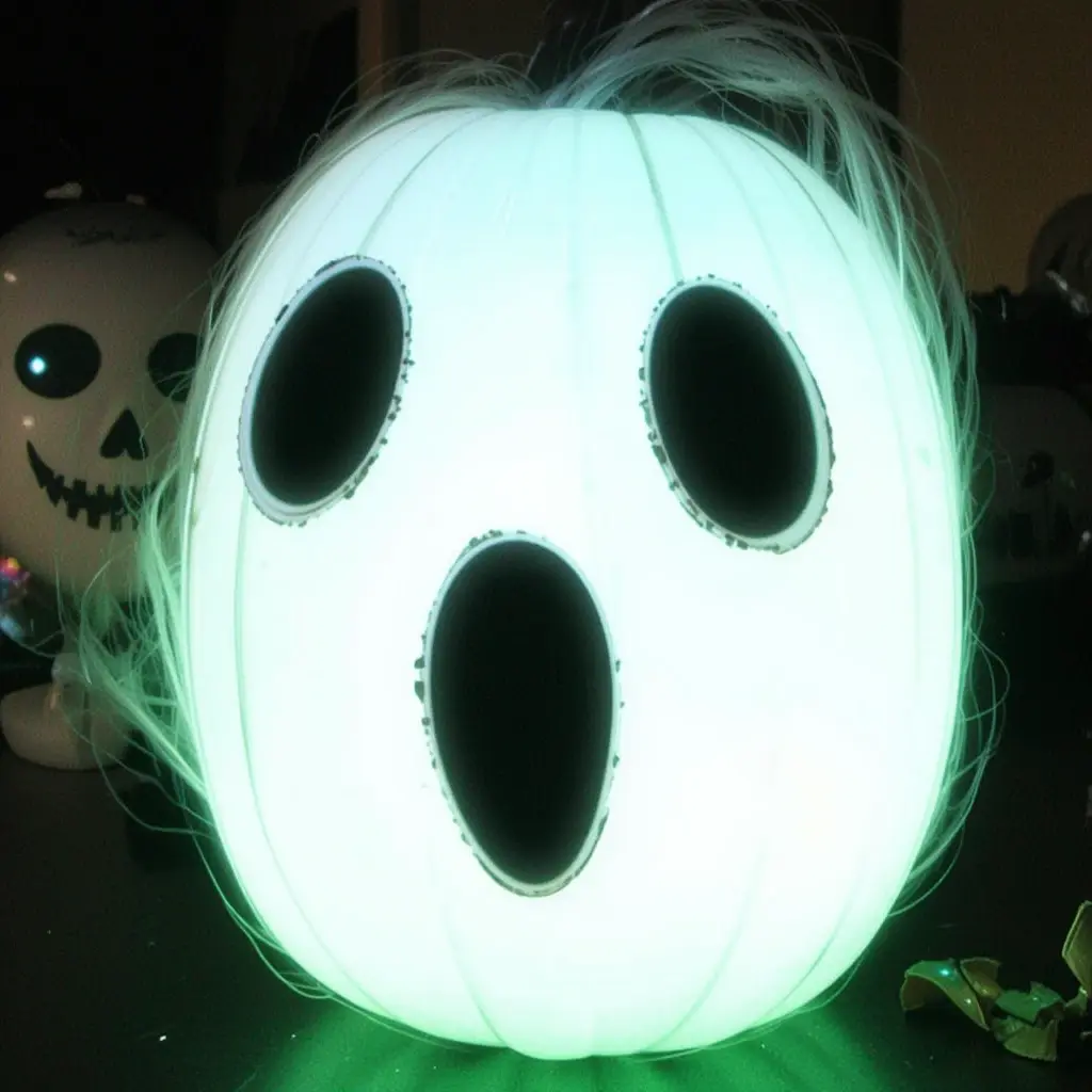 Use glow-in-the-dark paint to create a ghost face on a white or pale pumpkin. When the lights go off, your pumpkin lights up with personality. These are great for trick-or-treat night so your walkway has a little eerie glow. And no batteries needed—just charge them under a lamp during the day.