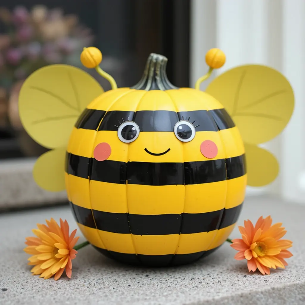 Paint your pumpkin yellow with black stripes, add cute little wings made from paper or felt, and maybe even googly eyes. It’s light-hearted and sweet, especially for kids’ tables or front steps. Unexpected, but totally charming. You can even add a few fake flowers around it for a garden vibe.