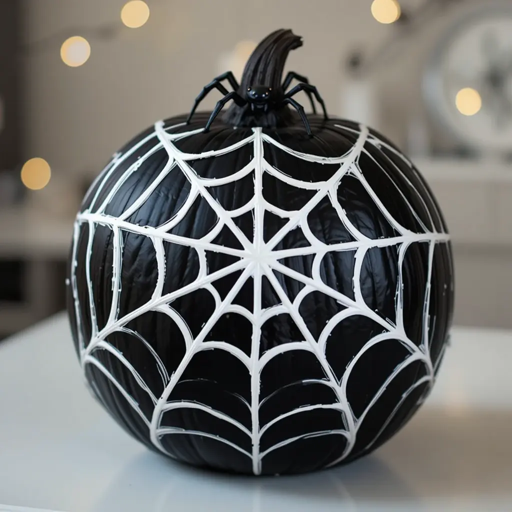 Paint the whole pumpkin black, then use white paint to draw a clean, geometric web around the surface. Add a little plastic spider glued on top for extra detail. It’s minimal, spooky, and looks awesome under string lights. Ideal for a more grown-up Halloween party.