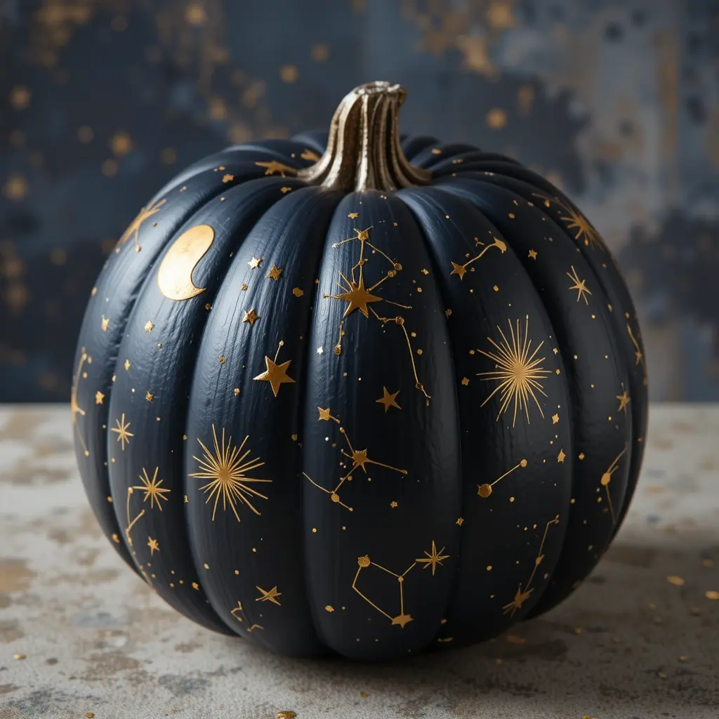 Go moody with navy or black paint and decorate with tiny gold stars, moons, and constellations. Think night sky in pumpkin form. It’s magical without being over-the-top Halloween. Use metallic pens for detailed zodiac designs.