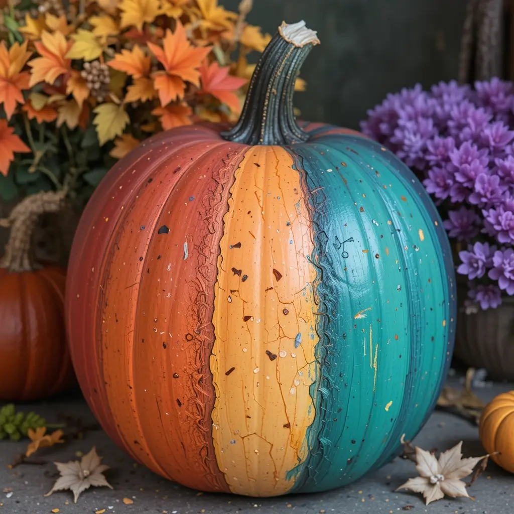 This one’s all about gradient color. Choose fall tones—like burgundy fading into orange, or teal into cream—and blend them up or down the pumpkin using a sponge brush. It’s stunning and feels surprisingly sophisticated. Great for a front porch that leans more “fall harvest” than “Halloween.”