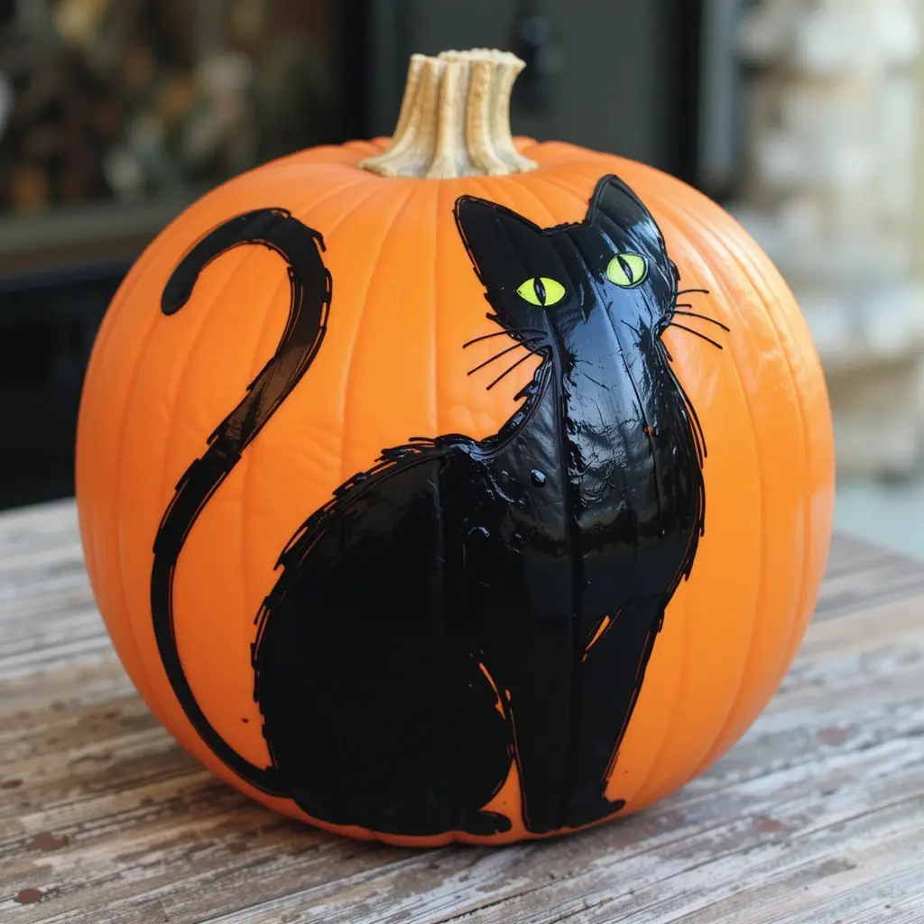 Channel Halloween vibes with a sleek black cat painted in silhouette. Use a solid orange or white pumpkin as your base. Paint the cat shape in black, and maybe add yellow or green eyes for a pop. It’s spooky but not too scary—great for families or school events.