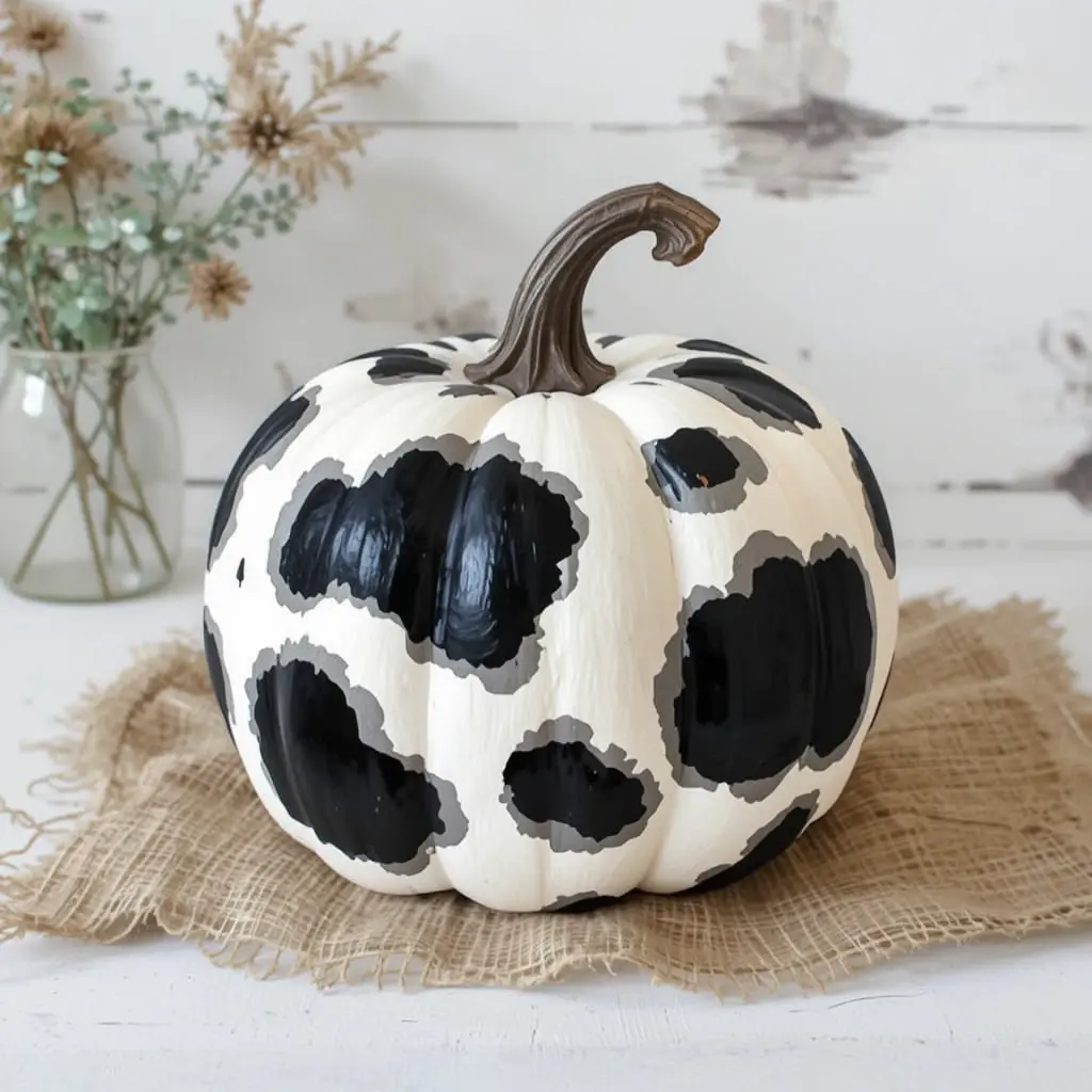 Add a little farmhouse flair with a trendy cow print pattern. Paint the base white and add irregular black spots. It’s cute, quirky, and a total eye-catcher. Pair it with burlap or buffalo plaid for extra rustic vibes.
