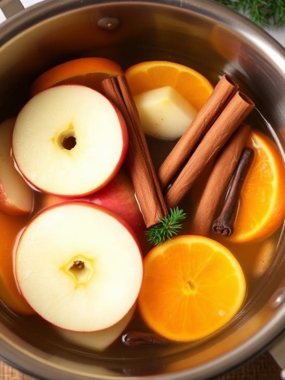 • Add apple slices, orange slices, cinnamon sticks, and cloves to a pot.