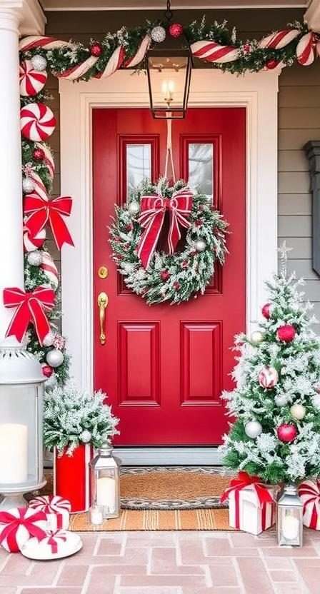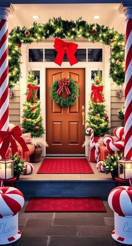 Line your walkway and porch with giant candy canes and red-white striped accents. Add peppermint-patterned pillows or rugs. Twinkling red and white lights enhance the sweet, festive vibe. A candy garland across the doorway seals the look. It’s cheerful, bold, and impossible to miss.