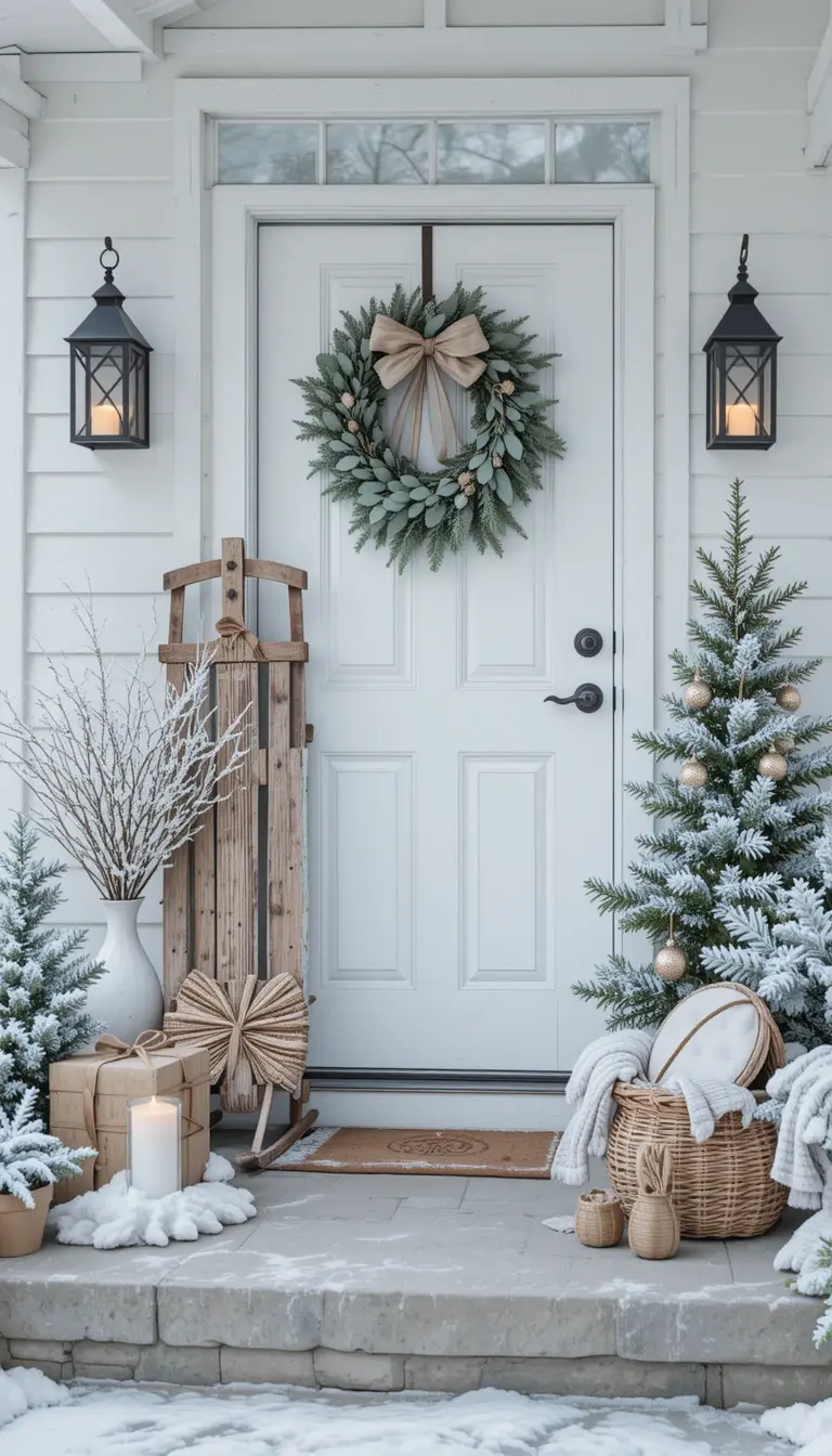 Keep it simple with clean lines, neutral tones, and lots of white. Use frosted greenery, a wooden sled, and subtle star lanterns. Incorporate woven baskets and natural fibers for a Scandinavian touch. A minimalist wreath made of eucalyptus adds quiet beauty. This look evokes a calm, snowy cabin in the woods.