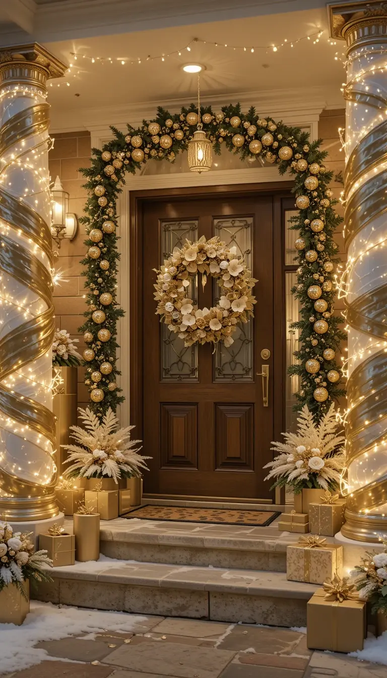 Go for metallic sophistication with gold, champagne, and ivory tones. Wrap your columns in shimmering gold ribbon. Add mirrored ornaments and metallic wreaths. Warm white lights make everything sparkle elegantly. This upscale look suits evening gatherings and modern homes beautifully.