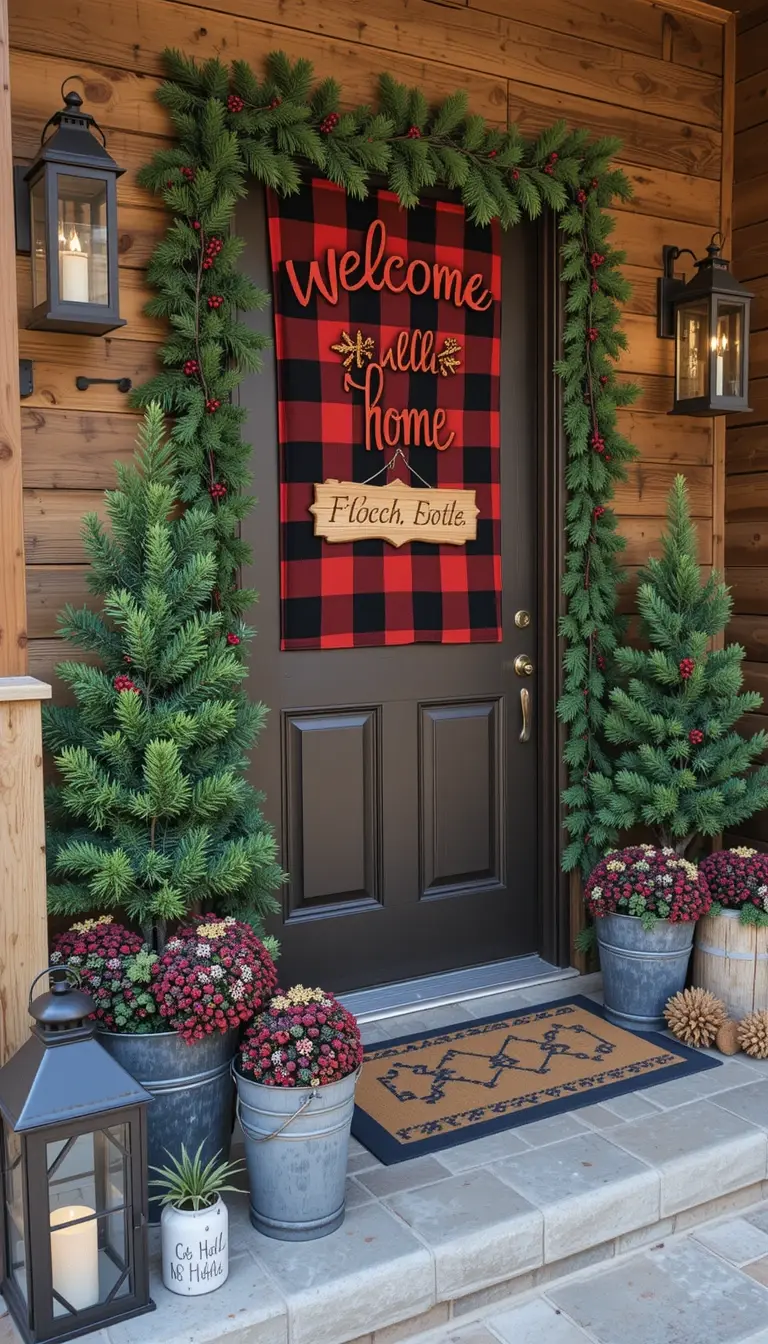 Pair the bold red-and-black plaid pattern with rustic pine accents. A simple wooden sign saying “Welcome Home” fits perfectly. Stack pinecones in large buckets for texture. Use matte black lanterns to contrast with the bright plaid. It’s rugged yet homey—perfect for mountain or cabin settings.