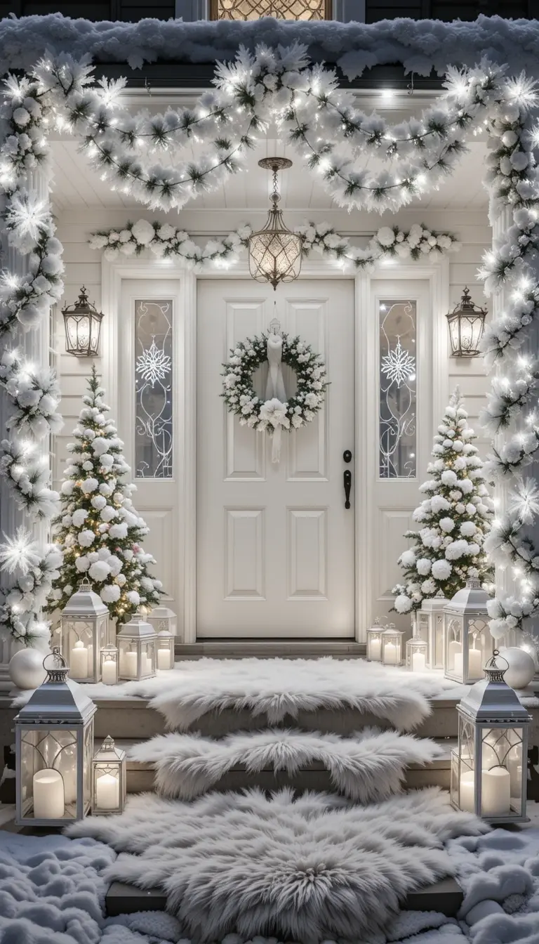 Go monochrome with all-white décor—snowflake garlands, faux snow, and white LED lights. Add frosted wreaths and shimmering ornaments for a magical touch. A white faux-fur rug and lanterns create a soft glow. This setup feels dreamy and ethereal, perfect for snowy evenings. It’s an elegant twist on a frosty theme.