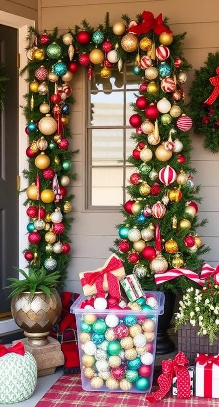 Cover your porch tree or garland with hundreds of mismatched ornaments—vintage, handmade, or family keepsakes. Use varying shapes and colors for texture. Add glittering fairy lights to make them shine. A clear storage bin of “extra ornaments” adds playful transparency. This theme celebrates creativity, nostalgia, and the beauty of imperfection.