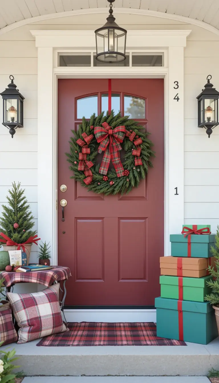 Use multiple plaid patterns in complementary colors—on pillows, ribbons, and tablecloths. A plaid-wrapped wreath sets the tone. Add matching gift boxes stacked beside the door. Combine with solid-color pieces to balance the visual weight. The result feels cheerful, cozy, and classically festive.