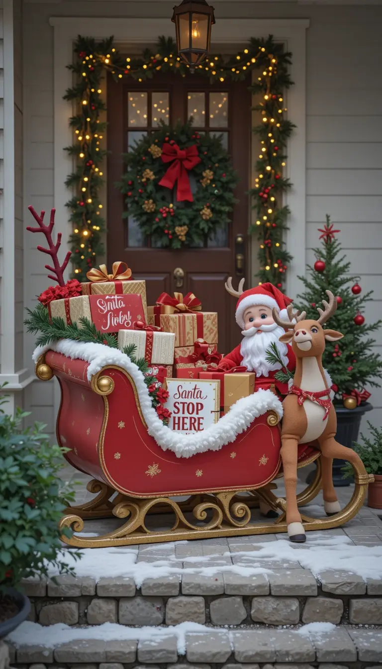 Set up a faux sleigh on your porch filled with wrapped presents and plush reindeer. Add a “Santa Stop Here” sign near the door. Red and gold tones make it shine. Incorporate jingle bells and twinkling lights for extra magic. This playful setup makes your home feel like Santa’s next destination.